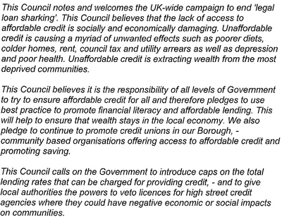 Liberal Democrat Councillors backed a motion moved by 2 Labour Councillors to crack down on the exhorbitant interest rates being charged by some companies.